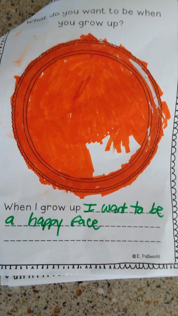 My daughter is currently learning about “community helpers” in preschool. She comes home with picture of mailmen and police officers. She colors pictures of teachers and doctors. She recently came home with a worksheet saying what she wanted to be when she grew up. Her answer was the most perfect response to that question I have ever seen – I want to be a happy face.