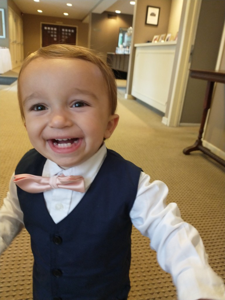The rest of the time was filled with him wandering away, me going and getting him, him smacking me in the face, me putting him down, repeat. He doesn’t talk so if something happens that he can’t say “no” to, he hits. He told me “no” a lot. The schedule of the wedding didn’t allow for a nap and it was starting to show. With each passing minute the wedding was getting closer and he was getting crabbier. I feared he was on a collision course with a tantrum half-way down the aisle.